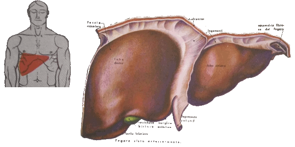 Il fegato è la ghiandola più estesa del corpo umano e ha sia funzione endocrina sia esocrina. Situata sotto il diaframma, sul lato destro del corpo, affianca lo stomaco e il colon traverso. Esso produce anche la bile per emulsionare i grassi, ed è anche il responsabile del metabolismo dei carboidrati e delle proteine, ma non solo.