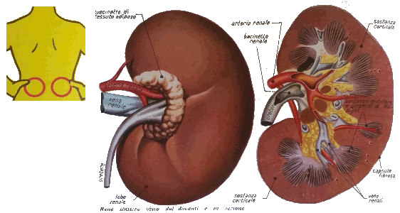 I reni sono organi pari escretori che, assieme alle vie urinarie, costituiscono l’apparato urinario. Sono due organi relativamente grandi (12x6x3 cm) situati ai lati della colonna vertebrale in zona lombare. Svolgono diverse funzioni, dalla depurazione del sangue e la regolazione del suo pH, al mantenimento dell’equilibrio idrico nei liquidi corporei.